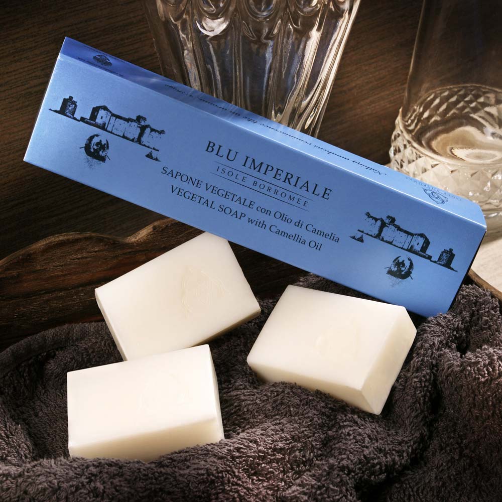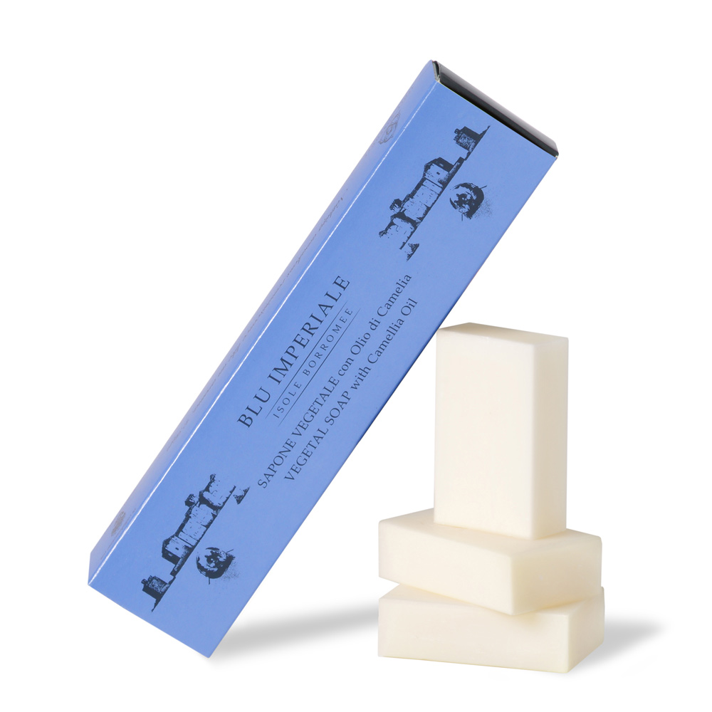 Vegetable soap with camellia oil, used in cosmetics for its moisturising and anti-aging properties. The consistency is light. The citrusy Imperial Blue fragrance, mild and delicate, energises thanks to a heart of orange pulp and a background of summer fruits. The set can also be used as a kit for guests. Each soap has a rectangular shape and is wrapped in white paper on which the Borromeo family crest is engraved. Less